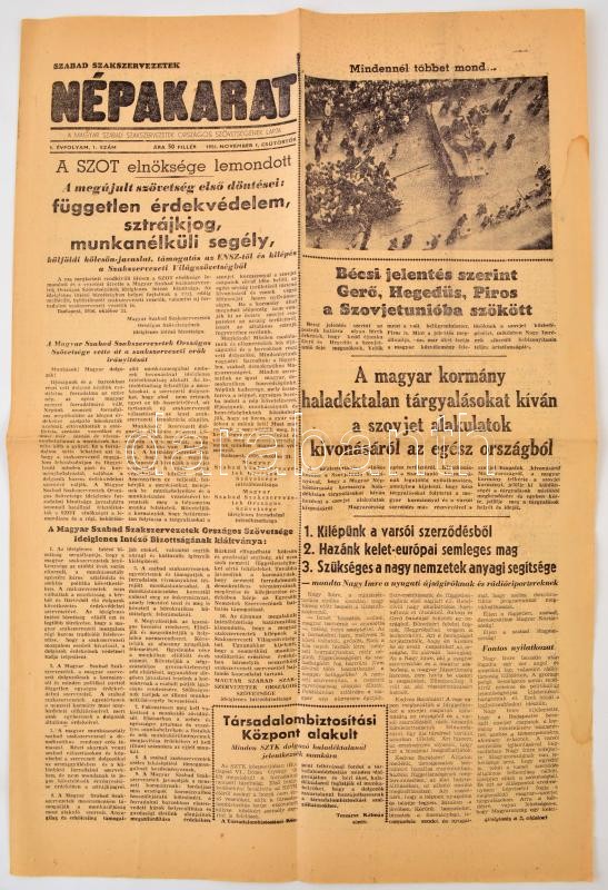 1956 a Népakarat szakszervezeti lap 1. évf. 1. száma (nov. 1.), érdeke... https://www.darabanth.com/de/32-Gross-Auktion/32.1/Kunst-Dokumente-andere-Sammelgebiete/Drucksachen~13371/1956-a-Nepakarat-szakszervezeti-lap-1-evf-1-szama-nov-1-erdekes-aktualis-hirekkel~II2038113