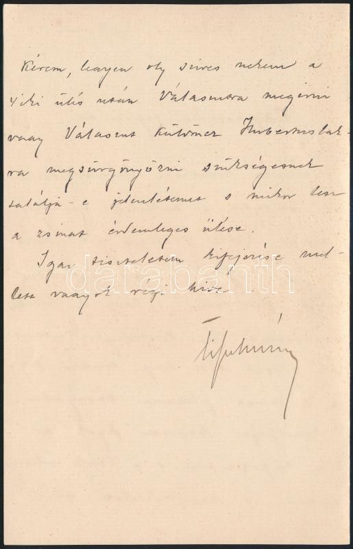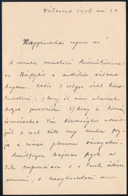 1906 ifj. Tisza Kálmán gróf (1867-1947) saját kézzel írt levele Szél Kálmán nagyszalontai esperesnek, református zsinat ügyében.2 beírt oldal, borítékkal.