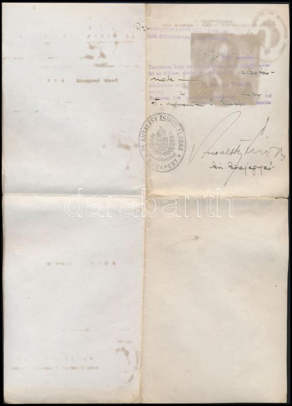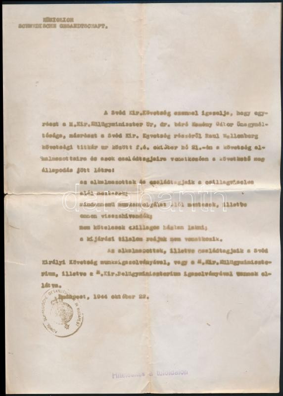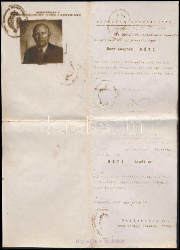 1944 2 db közjegyzői hiteles másolat: a budapesti svéd nagykövetség munkaviszony-igazolása magyar személy részére + igazolás a nagykövetségi dolgozók mentességéről