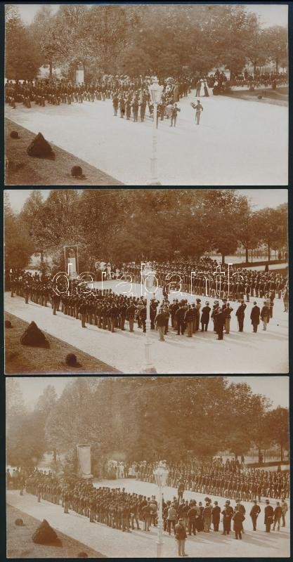 1907 I. Ferenc József császár mellszobrának felavatása a bécsújhelyi katonai akadémia udvarán, 3 db fotólap, hátoldalon németül feliratozva, 9×14 cm / Wiener Neustadt, "Enthüllung der Kaiserbüste" - unveiling of Franz Joseph I statue, 3 photos