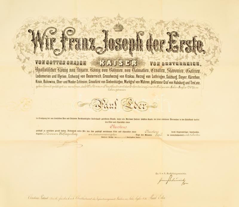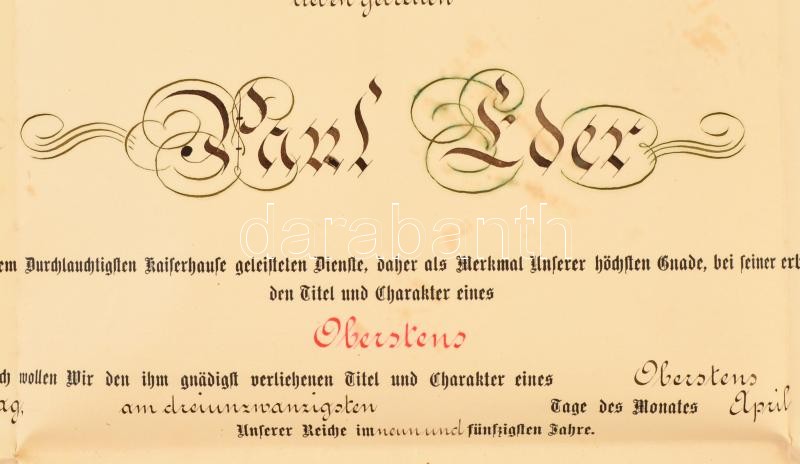 1907 Prága, I. Ferenc József császár által kiadott katonai címadományo... https://www.darabanth.com/de/32-Gross-Auktion/32.1/Kunst-Dokumente-andere-Sammelgebiete/Militaria~13366/1907-Praga-I-Ferenc-Jozsef-csaszar-altal-kiadott-katonai-cimadomanyozo-oklevel-rajta-Fer~II2019054