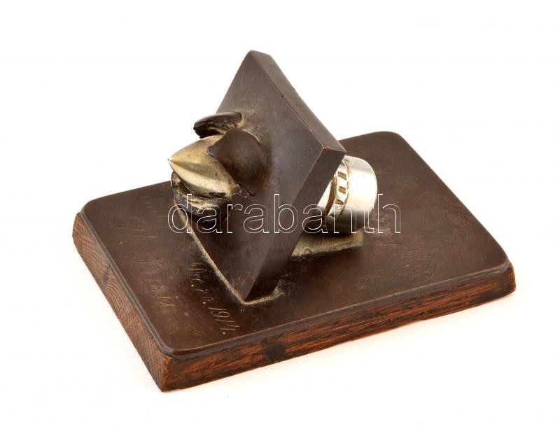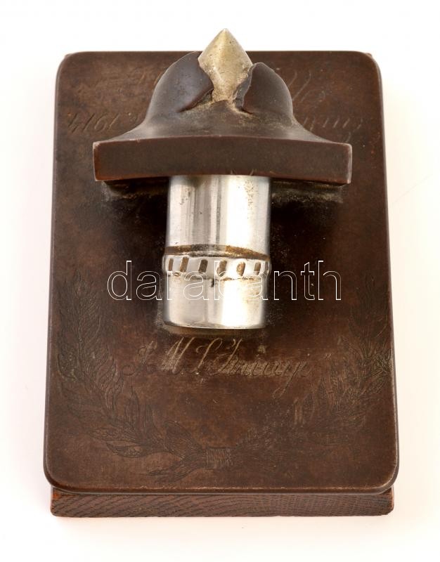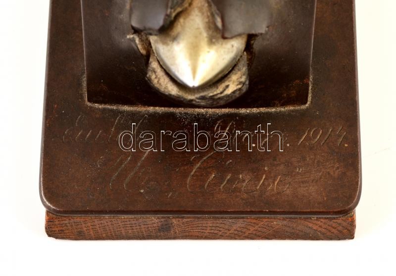 1914 Az S.M.S. Zrinyi hadihajó bevetésének emlékére készült egyedi plasztika "S.M.S. Zrínyi - Emlék 1914 dec 20. U "Curie"" gravírozással. Az emlék a Curie nevű francia tengeralattjáró elfogására utal a Polai kikötőbe történt betörése közepette. A tengeralattjáró később az osztrák-magyar flottában szolgált. Vas. / Memory of the S.M.S. Zrínyi battleship for the capture of the French submarine Curie in the port of Pola. The submarine under the name of U-14 served later in the Austro-Hungarian fleet. 12x8x7 cm