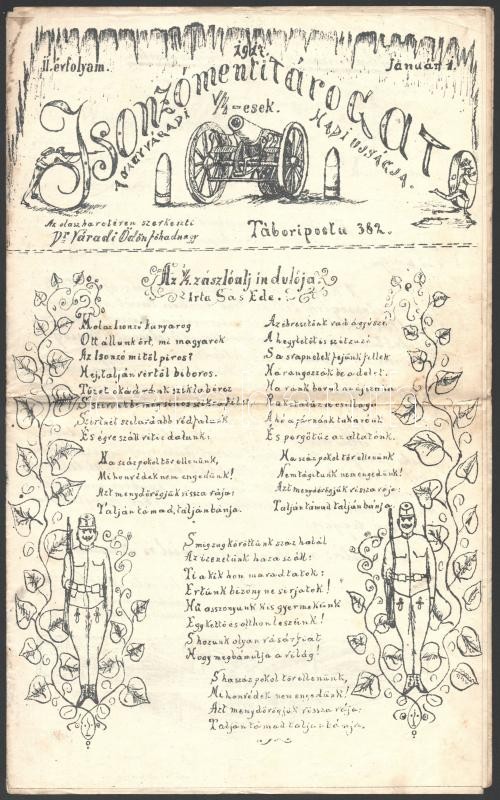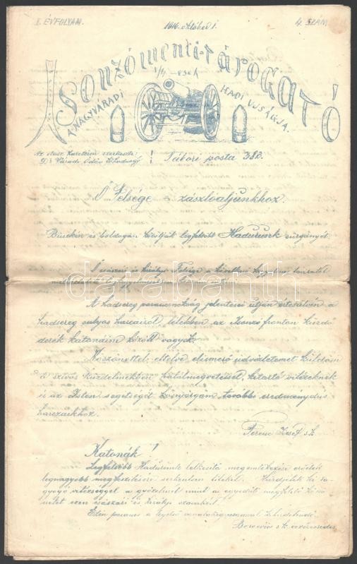 1916-1917 Isonzómenti Tárogató, a nagyváradi V/4-esek hadiújságja, I. ... https://www.darabanth.com/de/32-Gross-Auktion/32.1/Kunst-Dokumente-andere-Sammelgebiete/Militaria~13366/1916-1917-Isonzomenti-Tarogato-a-nagyvaradi-V4-esek-hadiujsagja-I-evf-1-4-es-II-ev~II2044376