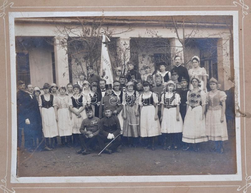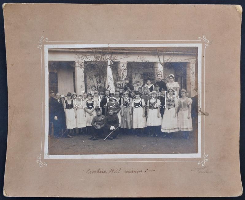 Beschreibung: 1921 Orosháza, Csoportkép katonákkal, csendőrtisztekkel, különítményesekkel, nagyméretű fotó Lampert műterméből, kartonra ragasztva, 17×23 cm