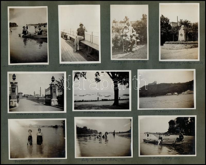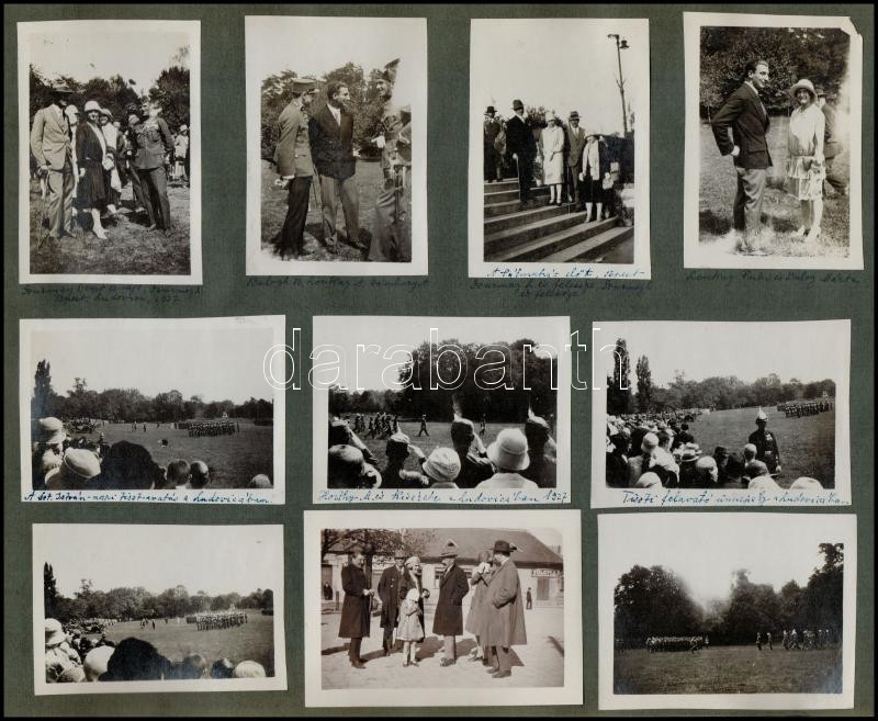 1927 Tisztavatás a Ludovikán, rajta Horthy Miklós kormányzóval magasrangú katonatisztek között, rajta Lonkay Antal (1903-?) keramikus, szobrász, plakáttervezÅ‘ grafikus művésszel,(Gorka Géza verÅ‘cei műhelyének társalapÃtójával, valamint Szurmay DezsÅ‘vel (1886-1945) elsÅ‘ világháborús veterán katonatiszt és hÃres műkertész, és vitéz Szurmay Lajos (1888-1959) késÅ‘bbi vezérÅ‘rnagy, (nagybácsikájuk vitéz uzsoki báró Szurmay Sándor (1860-1945) tábornok, korábbi hadügyminiszter), 10 fotó kartonon, feliratozva, a hátoldalán 10 db 1927-es balatoni-váci nyaralás fotóival, feliratozva, egy fotó sarkán apró hajtásnyommal, 5x8 cm és 6x9 cm közötti méretben,