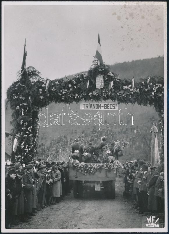 1938 Felvidékre bevonuló katonák Trianon-Bécs feliratú virágkapu alatt... https://www.darabanth.com/de/32-Gross-Auktion/32.1/Kunst-Dokumente-andere-Sammelgebiete/Militaria~13366/1938-Felvidekre-bevonulo-katonak-Trianon-Becs-feliratu-viragkapu-alatt-Kisse-foltos-12x16-cm~II2043785