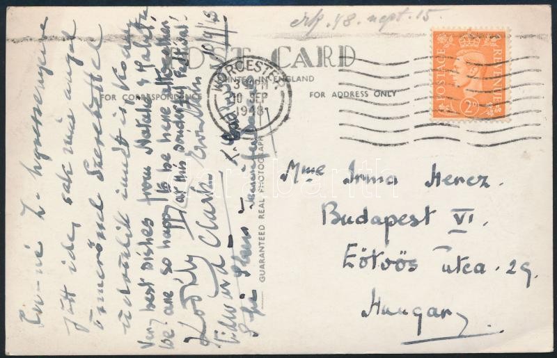 1948 Kodály Zoltán (1882-1967) zeneszerző által Londonból írt és aláírt képeslap, melyet aláírt még Erwin Stern (1885-1938) osztrák zeneszerző és író, Edward Clark (1880-1962) angol karmester és zenei producer, Andor Ilona (1904-1977) karvezető, Kodály tanítványa
