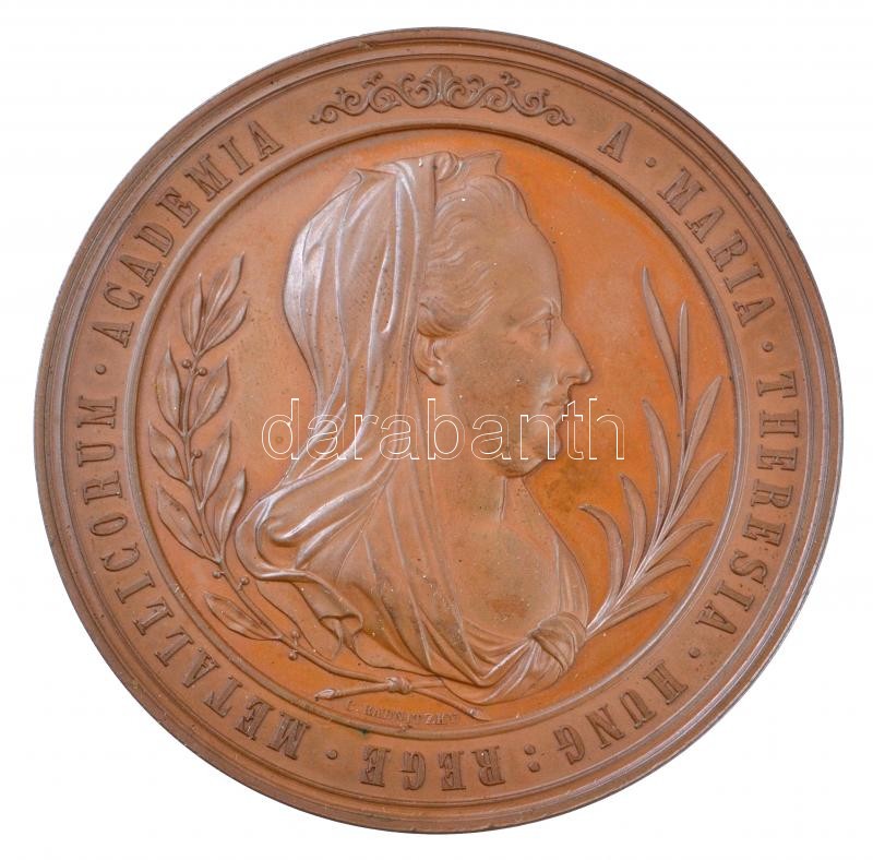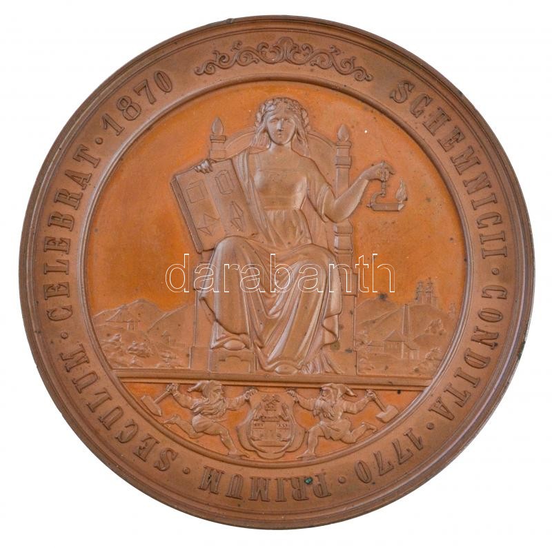 Carl Radnitzky (1818-1901) 1870. "A Selmecbányai Bányászati és Erdészeti Akadémia 100. évfordulója" Br emlékérem. "A. MARIA. THERESIA. HUNG: REGE. METALLICORUM. ACADEMIA - C. RADNITZKY / SCHEMNICII. CONDITA. 1770. PRIMUM. SECULUM. CELEBRAT. 1870" (103,43g/69,5mm) T:1,1- kis ph. /