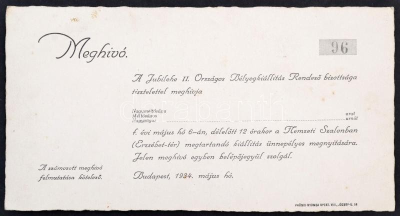 1934 A Jubilehe II. Országos bélyegkiállítás számozott meghívója. Háto... https://www.darabanth.com/de/320-Fernauktion/320.0/Andere-Sammelgebiete/Drucksachen~500029/1934-A-Jubilehe-II-Orszagos-belyegkiallitas-szamozott-meghivoja-Hatoldalan-rajzzal~II1601374