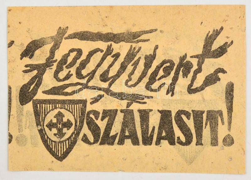 1944 Fegyvert, Szálasit, nyilas röplap 11x8 cm https://www.darabanth.com/de/320-Fernauktion/320.0/Andere-Sammelgebiete/Drucksachen~500029/1944-Fegyvert-Szalasit-nyilas-roplap-11x8-cm~II1766806