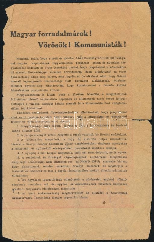 Beschreibung: 1945 Magyar forradalmárok, vörösök, kommunisták c. Dálnoki Miklós Béla, a magyarországi szovjetkormány miniszterelnökének kiáltványa röplapon.