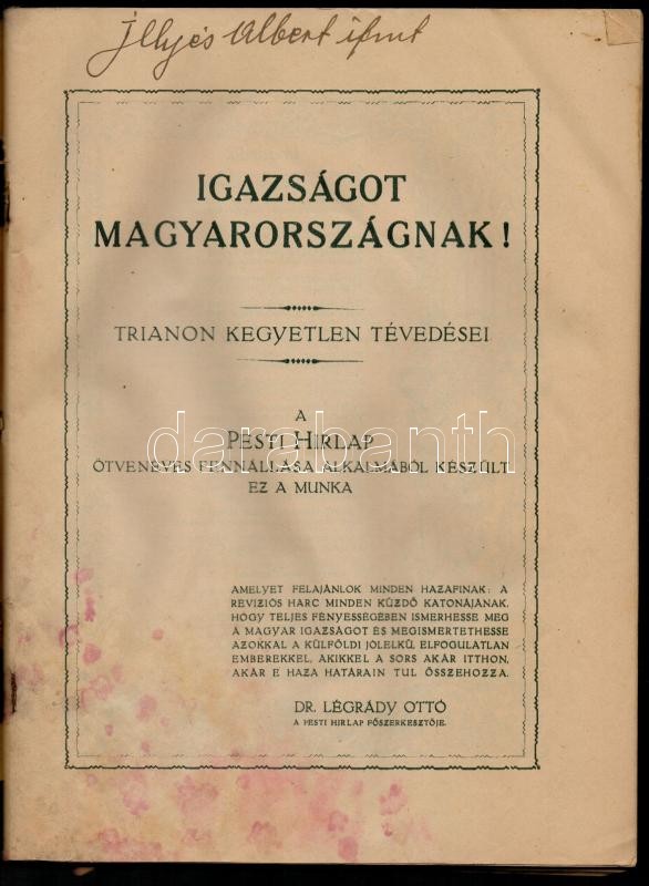 cca 1928 Igazságot Magyarországnak! Trianon kegyetlen tévedései, főszerk.: Légrády Ottó, a Pesti Hírlap melléklete, papírkötésben, kissé szakadt borítóval, 150 p.