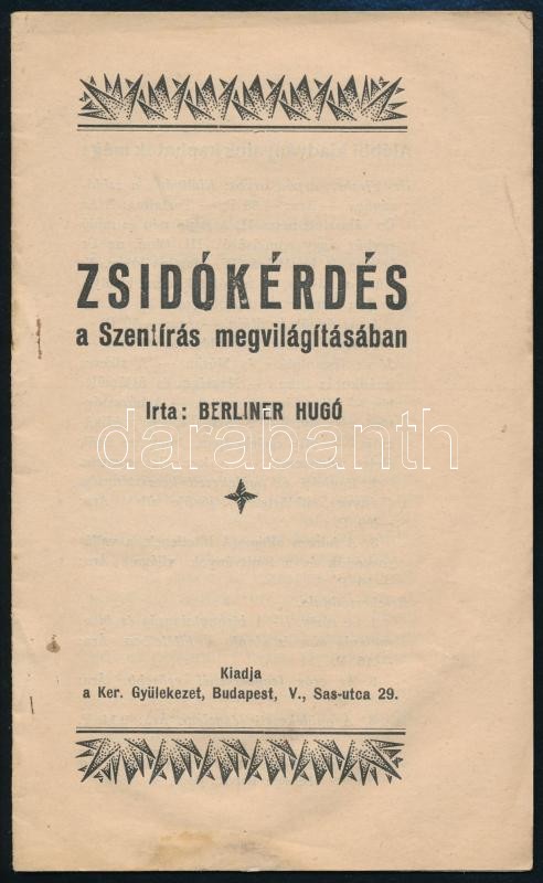 cca 1930-1940 Berliner Hugó: Zsidókérdés a szentírás megvilágításában.... https://www.darabanth.com/de/320-Fernauktion/320.0/Andere-Sammelgebiete/Judaica~500025/cca-1930-1940-Berliner-Hugo-Zsidokerdes-a-szentiras-megvilagitasaban-Bp-Ker-Gyulekez~II1769043