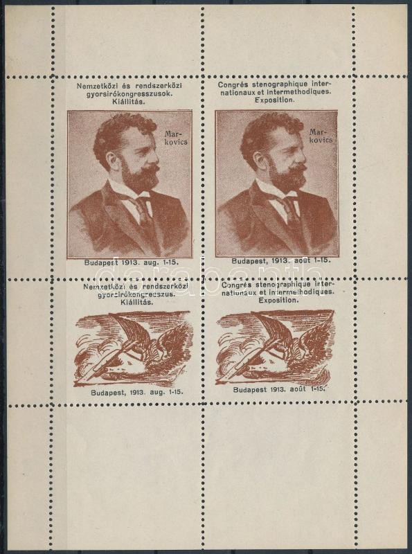 Beschreibung: 1913 Nemzetközi és rendszerközi gyors és gépírókongresszus, kiállítás 4 bélyeget tartalmazó levélzáró kisív