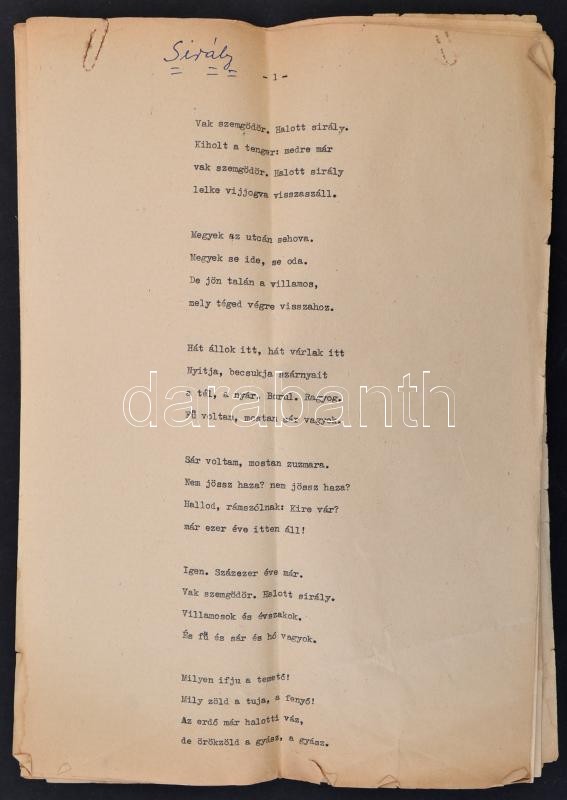 Beschreibung: Zelk Zoltán (1906-1981) Sirály c. verse, gépelt, a végén Zelk Zoltán aláírásával, a széleken szakadozott, gyűrött, hosszában hajtásnyommal, 14 p.