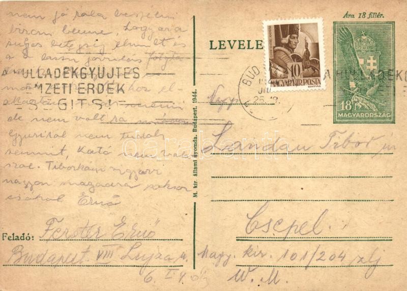 1944 Ferster Ernő levele Landau Tibor úr zsidó 101/204. KMSZ-nek (közérdekű munkaszolgálatos) a csepeli munkatáborba / WWII Letter for a Jewish labor serviceman to the labor camp of Csepel. Judaica + 18f Ga.