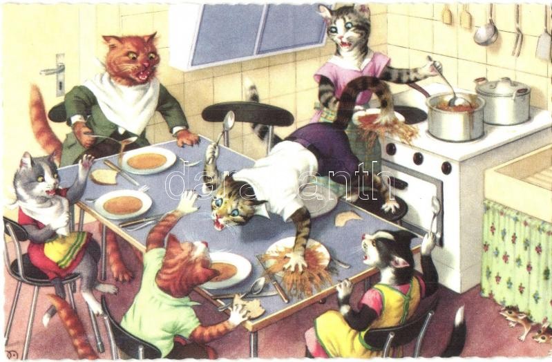 Cats having dinner, quarrel by the table. Colorprint B. Special 2269/5... https://www.darabanth.com/de/320-Fernauktion/320.0/Ansichtskarten/Katzen~1500070/Cats-having-dinner-quarrel-by-the-table-Colorprint-B-Special-22695--modern-postcard~II1765033