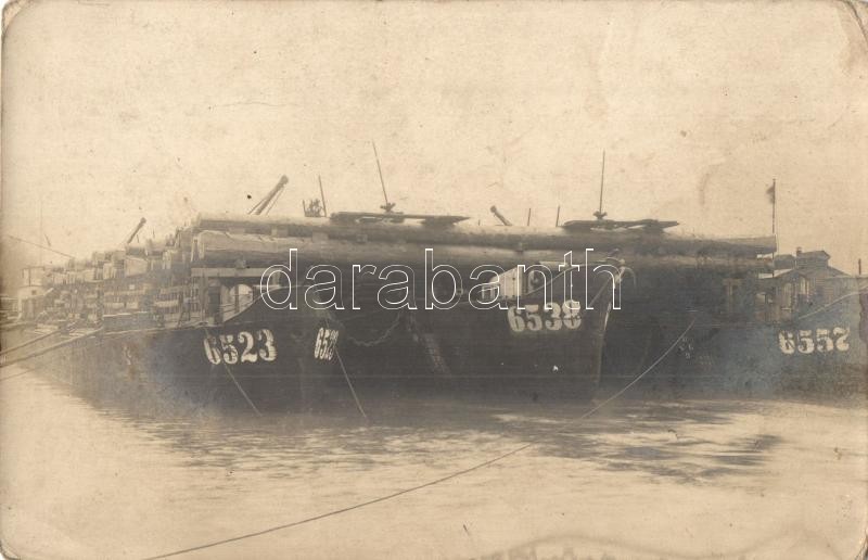Beschreibung: K.u.K. katonai faszállító uszályok / WWI Austro-Hungarian timber transporting barges, photo (kopott sarkak / worn corners)