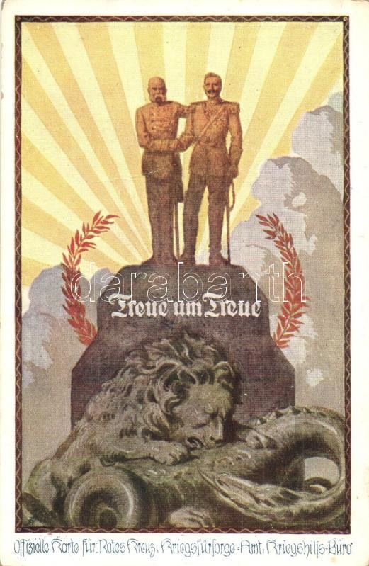 Treue um Treue. Offizielle Karte für Rotes Kreuz Kriegsfürsorge-Amt. Kriegshilfs-Büro Nr. 48-d / Viribus Unitis propaganda, Franz Joseph, Wilhelm II (EK)