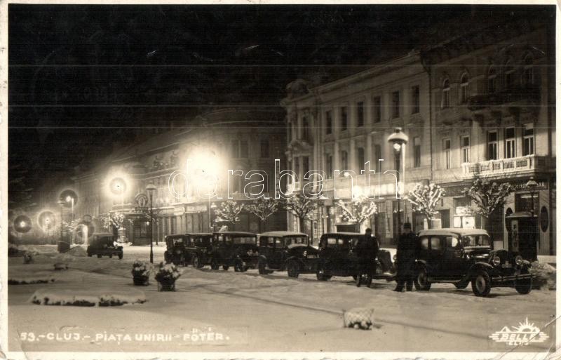 Beschreibung: 1939 Kolozsvár, Cluj; Piata Unirii / Fő tér télen, automobilok, üzletek / main square in winter, automobiles, shops. Belle photo (EK)