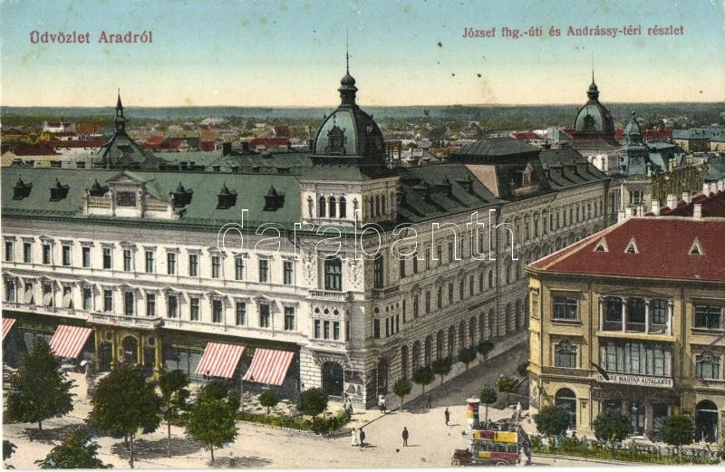 Arad, József főherceg út és Andrássy tér, autóbusz, sörcsarnok és étterem, Első Magyar Általános Biztosító Társaság. Kiadja Kerpel Izsó / street view, square, autobus, beer hall and restaurant, insurance company (EK)
