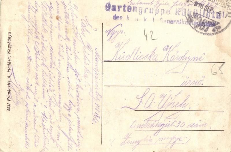 Beschreibung: Nagybánya, Baia Mare; Kereszthegyi aranybánya bejárata, Lobkovitz altárna, csille. Frankovits A. kiadása / Dealul Crucii Adit, gold mine entrance, mine cart + Gartengruppe Küküllő des k.u.k. Generalkommandos (ázott sarok / wet corner)