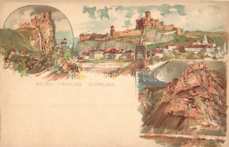 Beschreibung: 1896 (Vorläufer!) Beckó, Trencsén, Sztrecsnó vár, kastély / Beckov, Trencin, Strecno castles. Art Nouveau, litho. s: Kimnach + 2 Kr. Ga. (barna)