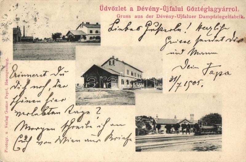 Beschreibung: Dévényújfalu, Theben-Neudorf, Devínska Nová Ves (Pozsony, Bratislava); Gőztéglagyár, Vasútállomás, gőzmozdony. Gustav Peyrl kiadása / brick factory, railway station, locomotive (EK)