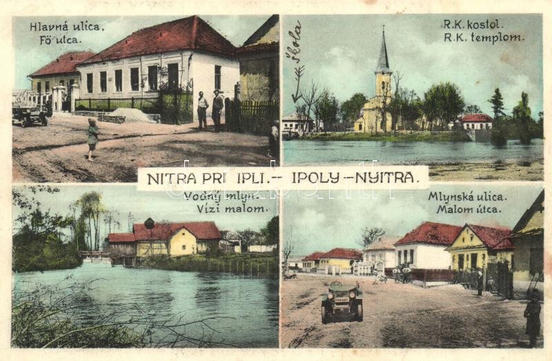 Ipolynyitra, Nitra pri Ipli, Nitra nad Iplom; Hlavná ulica, R. k. kostol, Vodny mlyn, Mlynská ulica / Fő utca, automobil, Római katolikus templom, iskola, Vízimalom, Malom utca, üzlet / main street, automobiles, church, school, water mill, street view, shop (fl)
