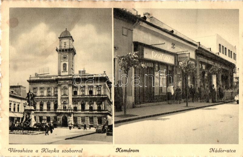 Komárom, Komárno; Városháza, automobilok, Klapka György szobor, Nádor utca, Szalay üzlete / town hall, automobiles, statue, street view, shops (fl)