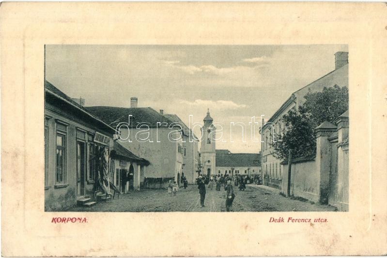 Beschreibung: Korpona, Krupina; Deák Ferenc utca, Kaufmann üzlete, templom. W. L. Bp. 4775. Kiadja Reviczky Frigyes / street view, shop, church (fl)