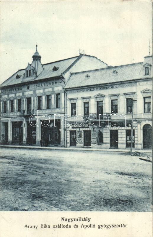 Nagymihály, Michalovce; Arany Bika szálloda, Strömpl Gábor kávéháza, A... https://www.darabanth.com/de/320-Fernauktion/320.0/Ansichtskarten/Slowakei~1500006/Nagymihaly-Michalovce-Arany-Bika-szalloda-Strompl-Gabor-kavehaza-Apollo-gyogyszertar-~II1769024
