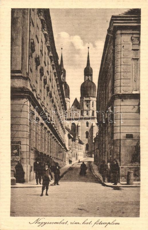Beschreibung: Nagyszombat, Tyrnau, Trnava; Római katolikus főtemplom, reklámtábla. Winter Zsigmond kiadása / Catholic church, advertising panel