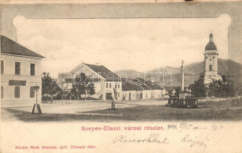 Beschreibung: Szepesolaszi, Spisské Vlachy; Fő tér, Takarékpénztár, templom, üzletek. Kiadja Matz Gusztáv / main square, savings bank, church, shops (EK)