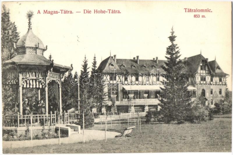 Tátralomnic, Tatranska Lomnica (Tátra); Zenepavilon zenészekkel, száll... https://www.darabanth.com/de/320-Fernauktion/320.0/Ansichtskarten/Slowakei~1500006/Tatralomnic-Tatranska-Lomnica-Tatra-Zenepavilon-zeneszekkel-szalloda-Divald-Karoly-musi~II1772912