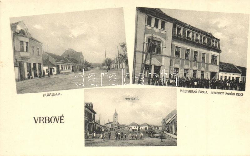 Verbó, Vrbové; Hlav. ulica, Mestianska Skola, Internat Rabího Reieh, Namesti / Fő utca, üzletek, Reieh rabbi által alapított internátus, iskola, Fő tér, Oszlánszky Viktor kiadása / main street, shops, main square, boarding school founded by rabbi Reieh