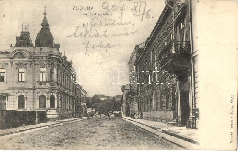 Beschreibung: Zsolna, Sillein, Zilina; Kossuth Lajos utca, Ripper Mór és fiai üzlete. Lövy Fülöp kiadása / street view, shops (EK)