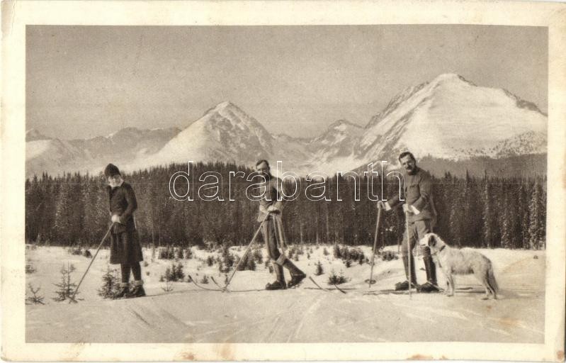 A Csorba tónál. Háttérben balról a Szoliszkó, jobbról a Pátria. Síelők a Tátrában, sífutás, téli sport / Am Csorber See. Im Hintergrund rechts die Patria, links das Szoliszko / Pri Strbskom plesy v úzadi z lava Solisko, z prava Pátria / skiing, skiers, winter sport (fl)
