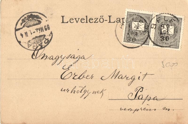 Beschreibung: 1899 Beled, Barthodeiszky kastély, Doprentet Gábor üzlete, vendéglő, étterem. Art Nouveau, floral (EK)