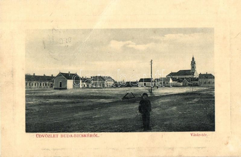 Beschreibung: Bicske, Buda-Bicske; Vásártér, templom. W. L. Bp. 87. Kiadja Lichtenstein Mór (fa)
