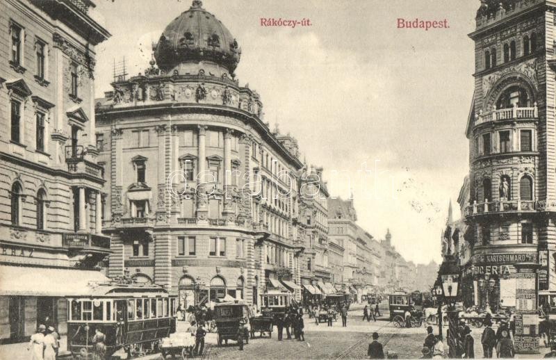 Beschreibung: Budapest VIII. Rákóczi út (Blaha Lujza tér), villamosok, kávéház, fogorvos, drogéria (gyógyszertár), Kartschmard üzlete. Divald Károly (EK)