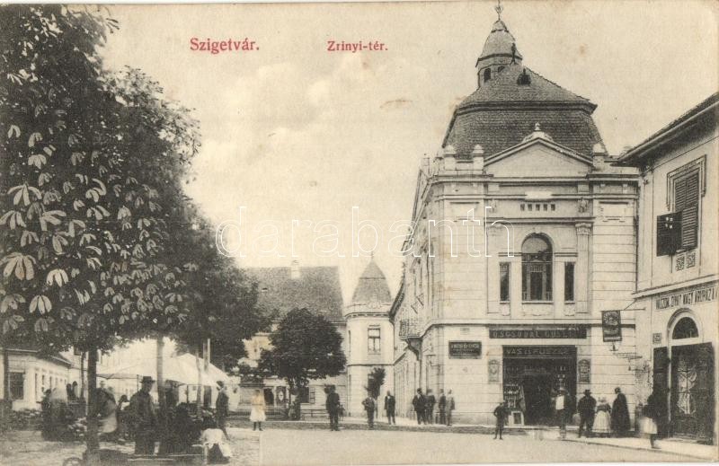 Beschreibung: Szigetvár, Zrínyi tér, Oscsodál Gusztáv üzlete, Magyar-Francia Biztosító, piac. Szigeti Vilmos kiadása (Rb)