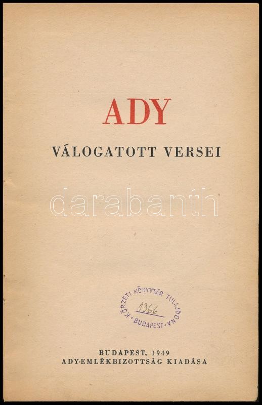 Ady Endre: Ady válogatott versei. Válogatta: Losonczi Géza, Bóka László, Király István. Bp.,1949, Ady-Emlékbizottság. Átkötött félvászon-kötés, kopottas borítóval, 20 és 21. oldalakon valamint a hátsó szennylapon és kötéstáblán tintás bejegyzéssel, intézményi bélyegzővel.