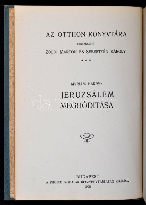 Az Otthon könyvtára sorozat 11 kötete Eredeti magyar novellák és elbeszélések I-II., Eredeti magyar novellák és elbeszélések IV. kötet: Hazai Hugó: A császár népei. Eredeti magyar novellák és elbeszélések V. kötet.: Majthényi József: Eredeti magyar novellák és elbeszélések. Egy vármegye a törökvilágban és egyéb elbeszélések. Ányos Gyula és egyéb elbeszélések. Révész Gyula: Az Urhiday-leányok. Antale France: A szilfák alatt. Myriam Harry: Jeruzsálem meghódítása I-II. Fordította Sebestyén Károlyné. Paul Marguerite-Viktor Marguerite: A gyermek-király. Bp.,1907-1908, Phönix,(Jókai-ny.) Kiadói aranyozott szecessziós egészvászon-kötés, márványozott lapélekkel, változó állapotban, többnyire kopott, foltos borítóval.