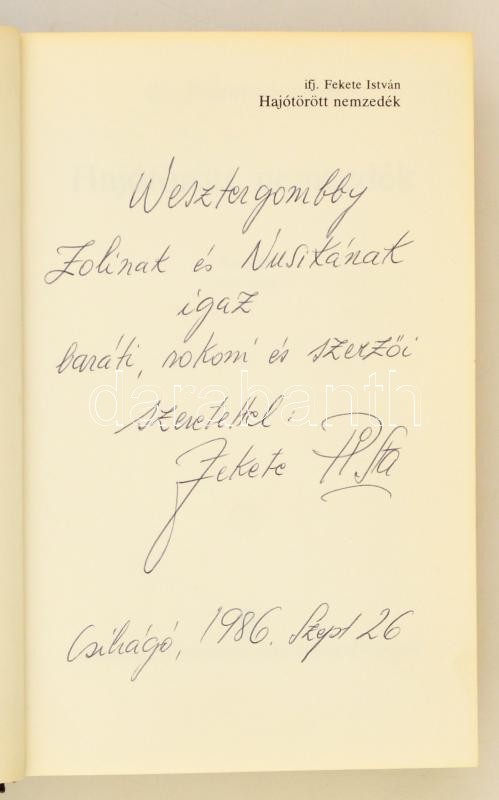 Ifj. Fekete István: Hajótörött nemzedék. Korrajz 1945-1956. Toronto-Canada,1984, Vörösváry. Kiadói egészvászon-kötés, kiadói papír védőborítóban. A szerző, ifj. Fekete István (1932-),Fekete István (1900-1970) fia, által dedikált.