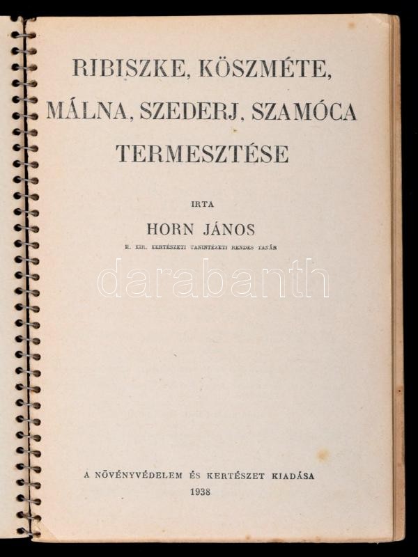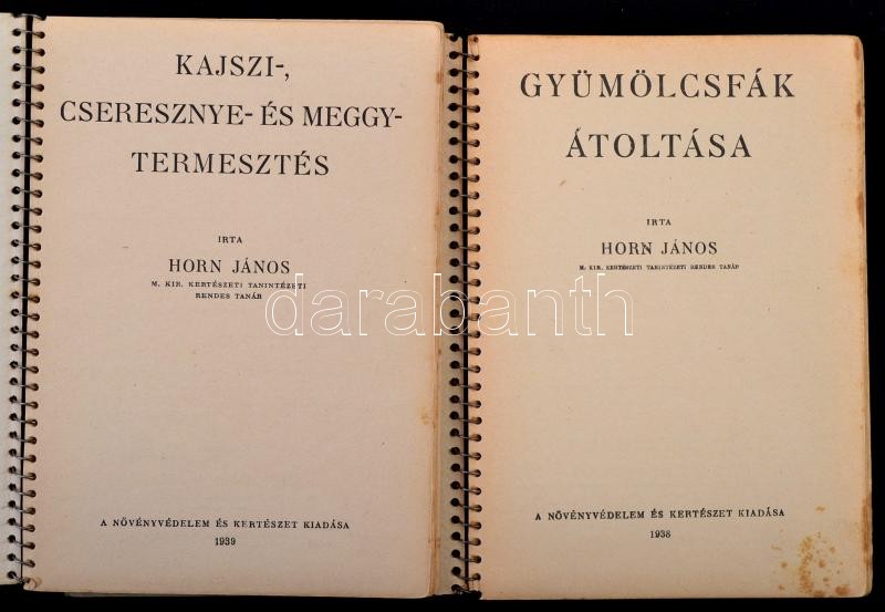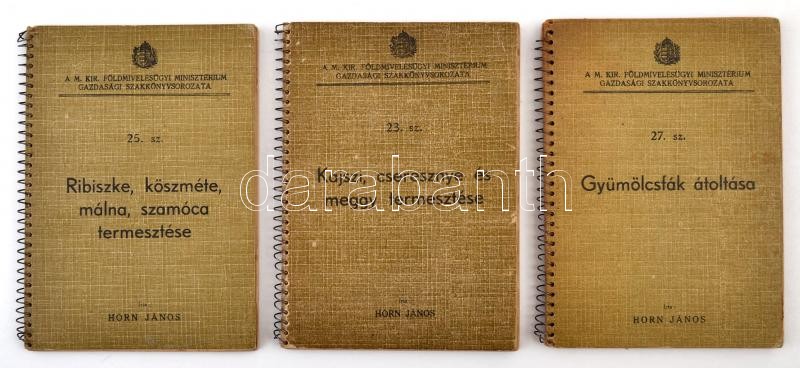 M. Kir. Földmivelésügyi Minisztérium Gazdasági Szakkönyvsorozatának 3 kötete (23, 25,27 számok), Horn János művei: Kajszi-, cseresznye- és meggytermesztés. Ribiszke, köszméte, málna, szederj, szamóca termesztése. Gyümölcsfák átoltása. Bp.,1938-1939, Növényvédelem és Kertészet. Kiadói spirál-kötés.