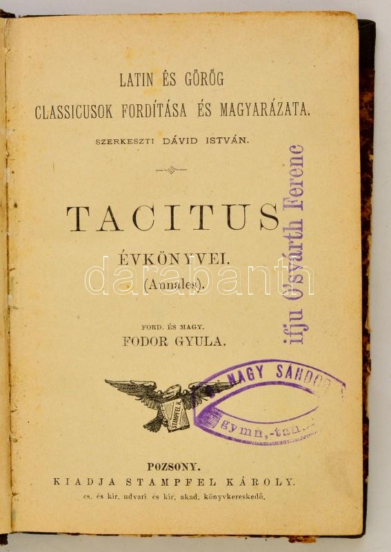 Tacitus évkönyvei. (Annales.) Ford.: Fodor Gyula. Latin és görög classicusok fordítása és magyarázata. Pozsony,é.n.,Stampfel Károly. Átkötött kopottas félvászon-kötés, magánkönyvtári bélyegzővel.