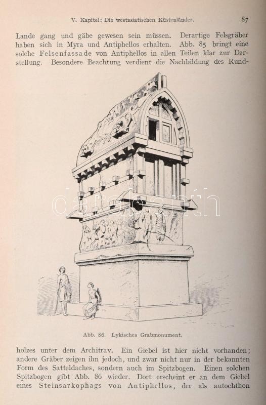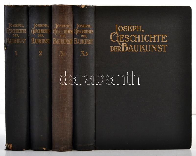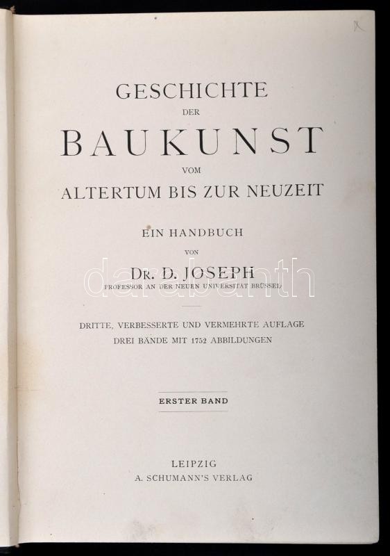 Dr. D. Joseph: Geschichte der Baukunst vom altertum bis zur neuzeit. 1-3/1-3/2. kötet.(Négy kötetben.) Leipzig,én.,A. Schumann's Verlag. Harmadik kiadás. Számos szövegközti és egészoldalas illusztrációval, német nyelven. Kiadói aranyozott egészvászon-kötés,a gerinceken kisebb sérüléssel.