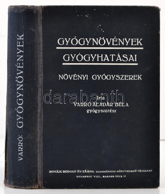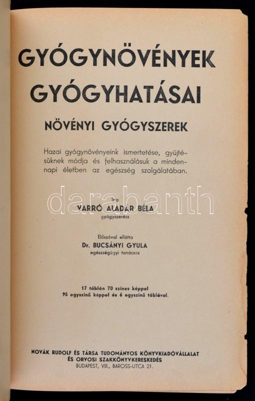 Varró Aladár Béla: Gyógynövények gyógyhatásai. Növényi gyógyszerek. Hazai gyógynövényeink ismertetése, gyűjtésüknek módja és felhasználásuk a mindennapi életben az egészség szolgálatában. Előszőval ellátta Dr. Bucsányi Gyula. 17 táblán 70 színes képpel 95 egyszínű képpel és 6 egyszínű táblával. Bp., é.n., Novák Rudolf és Társa Tudományos Könyvkiadóvállalat és Orvosi Szakkönyvkereskedés. Szövegközti fekete-fehér illusztrációkkal. Kiadói gerincű egészvászon kötés, kopott borítóval, kissé sérült gerinccel, egy-két helyen aláhúzással.