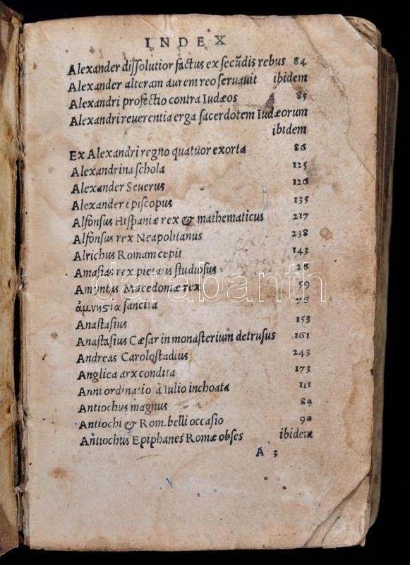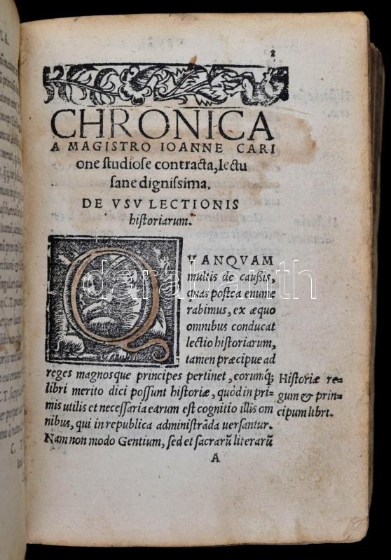 Iohannes Carionis (1499-1537): Chronica ... hn.,é.n, k.n., 22 sztl. lev.+510(255) p.+ 1. sztl. lev. Egészbőr-kötésben, kopott borítóval, a címlap és az index részből egy vagy több lap hiányzik, foltos. Johannes Carion (1499-1537) német asztrológus, matematikus és történész. Korán szoros kapcsolatba került Martin Lutherrel, Philipp Melanchthonnal és Georg Sabinusszal. Világkrónikája a kor népszerű olvasmánya volt, amelyet 1558-1560 között Philipp Melanchthon és Caspar Peucer dolgozott át tankönyvvé, a reformáció történetírásának alapja. Hosszú ideig ez a munka volt a domináns az egyetemes történelem oktatásához. Valószínűleg Károli Gáspár Két könyv minden országoknak és királyoknak jó és gonosz szerencséjöknek okairól (1563, Debrecen) c. műve megírásához az ihletet Carion Chronicájából merítette.
